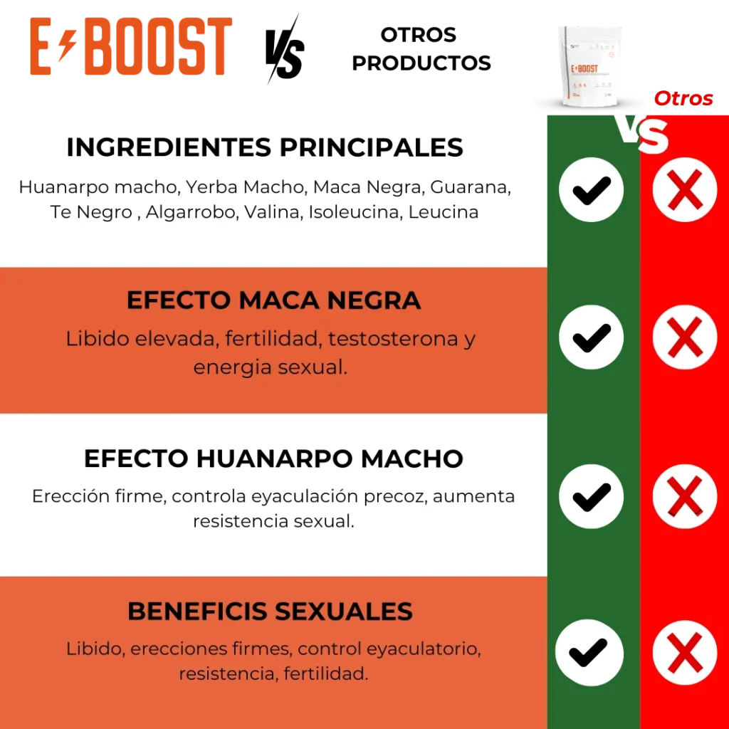 Porque E-BOOST no es un químico de efecto momentáneo, sino una fórmula completa que recupera tu energía, deseo y rendimiento desde dentro. Mientras otros productos sólo estimulan temporalmente, E-BOOST fortalece tu cuerpo, mejora tu circulación y potencia tu confianza día tras día.